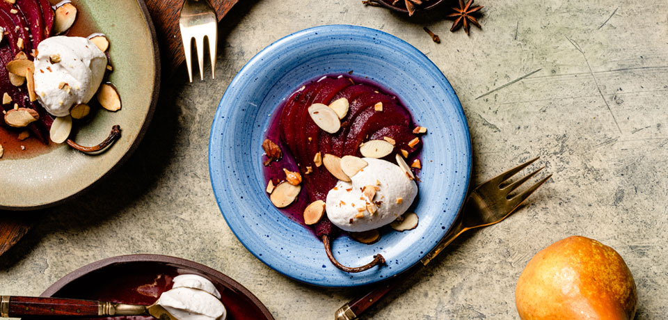 Choose a dark and fruit-forward red wine for the poaching liquid. The flavour of these poached pears will improve with time.