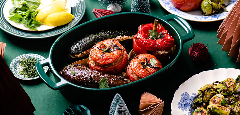 • Spoon the stuffing mixture into the tomatoes, eggplant, zucchini and peppers. Fill to the brim, then cover each vegetable with its reserved top or sliced side. Place the potato wedges around the stuffed vegetables and season with salt, pepper and oregano.