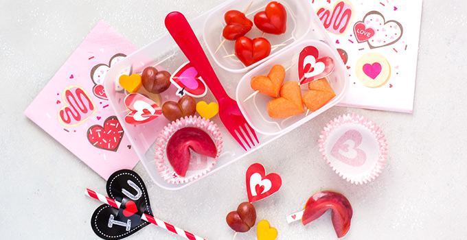 You can surprise the kids with a special Valentine’s Day lunch, too. It’s a piece of cake to make healthy lunch options entertaining and enjoyable. Try cutting tomatoes, grapes and baby carrots into heart shapes by slicing off the end of each one at a 45 degree angle. Then, skewer them together in a heart shape on a decorative toothpick.