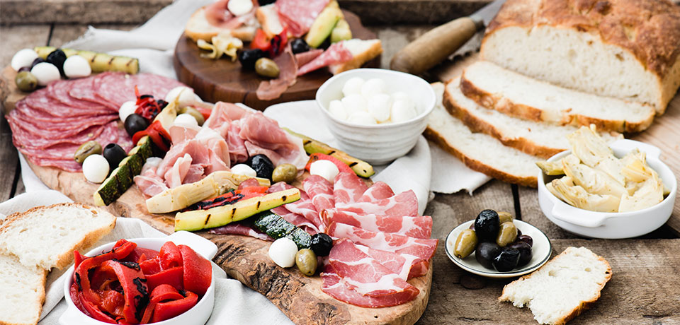 Antipasto signifies the start of the Italian meal. Serve a platter with your favourite items. Cured meats such as prosciutto, salami and capicola are presented rolled alongside fresh, roasted or pickled vegetables. Try black and green olives, marinated artichokes, grilled zucchini and roasted red peppers. You can also added cheeses like bocconcini.
